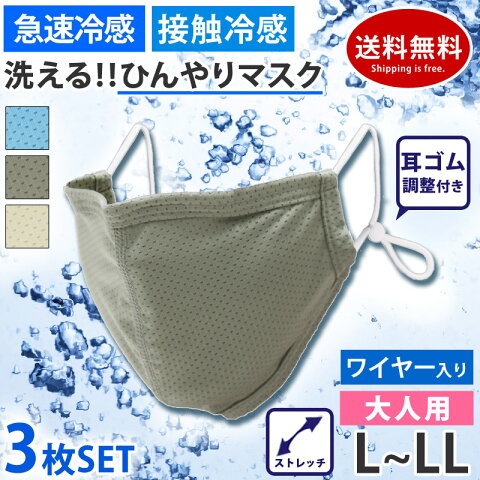 水洗いOK!繰り返し使えて衛生的&エコ! 家族と分け合ったり、洗い替えにも便利な3枚組! ■接触冷感+水で濡らして急速冷感! 接触冷感でひんやり気持ちいい!更に水で濡らして振るだけで簡単冷却! 夏の暑い時期やスポーツ時にオススメ! ■耳かけゴム調整機能付き アジャスター付きで耳が痛くなりにくい! 着用者に合わせて耳のゴム紐の長さを調整できます。