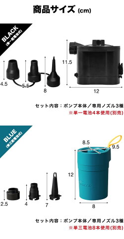 乾電池の種類/性能で選べる2タイプ ●ブラック(単一乾電池×4本使用) 電池長持ち、ポンプを頻繁に使用する場合にオススメ ●ブルー(単三乾電池×8本使用) 熱くなりにくく使いやすいので安心