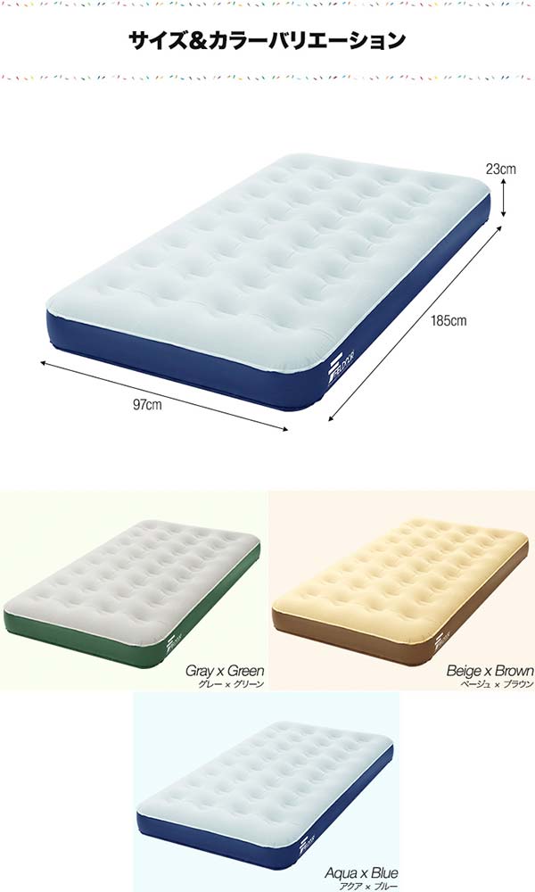 追加料金で電動ポンプセットも ・乾電池式ポンプ・ブラック(単一乾電池×4) ・乾電池式ポンプ・ブルー(単三乾電池×8) ・ACコンセント式ポンプ ・USB充電式ポンプ [こんな商品をお探しの方に] エアーベッド エアーマット エアベッド エアマット 簡易ベッド 簡易マット 寝具 マットレス 折りたたみ インフレータブル 電動ポンプ 車中泊 アウトドア寝具 マット キャンプマット キャンピングマット エアーマット エアマット 折りたたみ 寝具 ベッド キャンプ寝具 お昼寝 ごろ寝 寝心地 ポータブル 携帯 コンパクト 収納 軽量 アウトドア アウトドア用品 キャンプ キャンプ用品 キャンプ道具 キャンプギア Fieldoor フィールドア テント テント泊 ソロキャンプ ソロキャン ツーリング バイクツーリング 仮眠 防災用品 防災用 おしゃれ かんたん おすすめ 初心者 道具 アウトドアグッズ フィールドギア アクセサリー レジャー 山 海 ビーチ 釣り フェス イベント キャンピング グランピング スポーツ・アウトドア アウトドア アウトドア用寝具 マット商品詳細(エアーベッド) ブランド: フィールドア(FIELDOOR) カラー: ・グレー×グリーン ・ベージュ×ブラウン ・アクア×ブルー サイズ: (約)幅97cm×長さ185cm×厚さ23cm ツインサイズ 材質: PVC(ポリ塩化ビニル)※表面 : フロック仕上げ 重量: (約)1.9kg 耐荷重: (約)150kg 特記事項: ※エアポンプは付属しておりません。