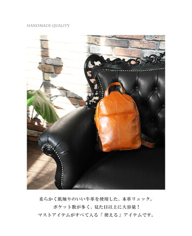 □ 商品詳細 □ 【素材】 ■牛革 ナイロン(裏地) 【仕様】 ■サイズ:縦約35cm 横約23cm 厚み約12cm ■収納:ポケット×7 (メインポケット 内部ファスナーポケット×2 内部ポケット×2 前面ポケット 前面ファスナーポケット 背面ファスナーポケット) 味のある風合いがたまらない本革製のリュックサックです。