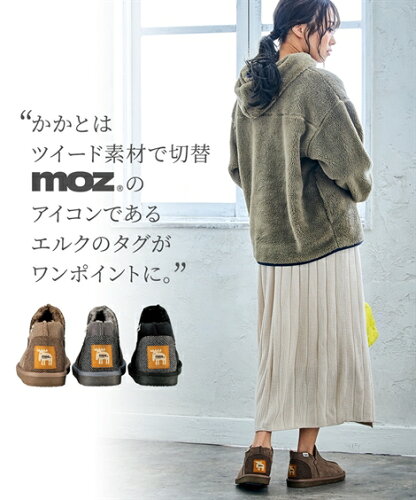 ・かかとはツイード素材で切り替え、mozのアイコンであるエルクのタグがワンポイントで入って可愛い!底裏にもこっそりエルクとMOZのロゴがあしらわれています。