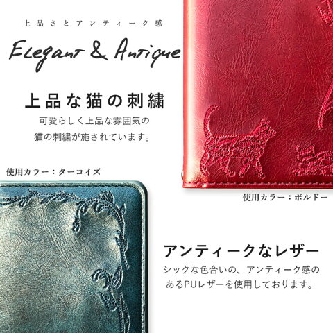 内側のケースに合わせてカメラ穴・フラッシュ穴等を一点一点、手作りであけております! 【猫 ネコ 刺繍 アンティーク シック 大人かわいい 上品 レディース プレゼント ケース カバー 手帳型 手帳 手帳型ケース 手帳型カバー スマホケース スマホカバー 】 [注意] ・カラーは必ずお選び下さい。