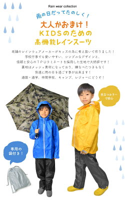 お子様は成長が早いと思うので、 悩まれたらワンサイズ上を おすすめしています! ■素材:ポリエステル100% (裏面:TPU ラミネート) 裏地:ポリエステル100% (上下総裏メッシュ) 耐水圧 10.000mm ■重量:上下合わせて約370g Attention ※商品の画像はできる限り実物に近づけるよう配慮しておりますが、 お使いのモニターやご覧になる環境によりましては カラーの見え方に差が出る場合がございます。