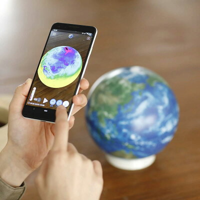 ■地球の「今」を見る スマホをアースボールにかざすと、リアルタイムで変化する地球上の「雲」「雨」「気温」をごらんいただけます。