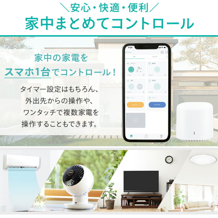 “外出先からでも操作ができる、スマート家電リモコン”◆ 安心・快適・便利、家中まとめてコントロール家中の家電をスマホ1台でコントロール!タイマー設定はもちろん、外出先からの操作や、ワンタッチで複数家電を操作することもできます。