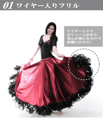 ボリュームたっぷり広がるスカート フラメンコ ベリーダンス ロング スカート マキシ丈 ペチコート パニエ 社交ダンス パソドブレ コーラス 演奏会 コンサート ファルダ ジプシー 衣装 闘牛舞 180°360°540° 黒 赤 ヤード ハロウィン コスチューム ミカドレス cr401-r